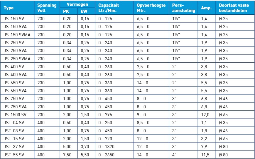Robu JS SV dompelpompen hebben een teruggetrokken waaier (Vortex) en kan zodoende vloeistoffen met grote concentraties vaste bestanddelen verpompen. Max. mediumtemperatuur 40 C voor alle modellen. De 230 Volt uitvoering is voorzien van een motorbeveiligingsschakelaar.